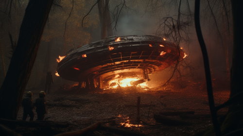 an alien spaceship crashed in the woods, half of the ship sunk in the ground, with flames burning all around. Arri Alexa, 45mm --ar 16:9