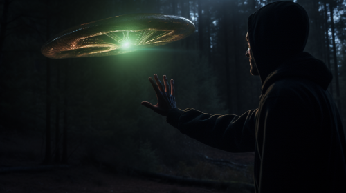 a cinematic close up shot of a man being abducted by aliens in the middle of the woods --ar 16:9