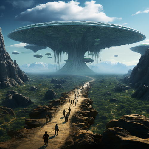 create a utopian collage, related to melodich techno music reminiscent of the word like a desert miss the rain, space, aliens, humanoids, with a backdrop of a starry universe in a minimalist