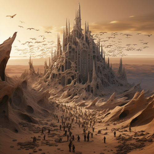 Alien humanoids watch primordial gods create our universe. Detailed, geometric.