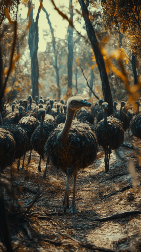 Great Emu War in Australia during the 1930s. Farmers struggling with emu invasions called in soldiers armed with machine guns to control the bird population. Full Body, Hyper Realistic Photography, , Cinema, Hyperdetail, Ultrahd, Color Correction, ultrahd, hdr, color grading, 8k' , no painting, drawing, unreal --ar 9:16