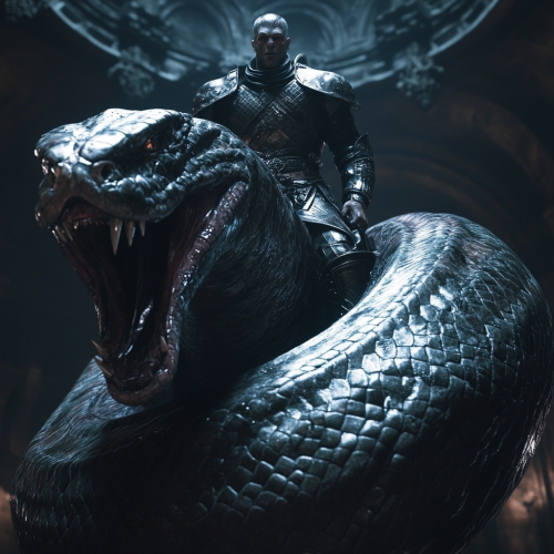a realistic picture in a game of thrones show style of a giant snake with a man riding it the man wears armor and the snake is dark and menacing the picture is photo realistic and cinematic