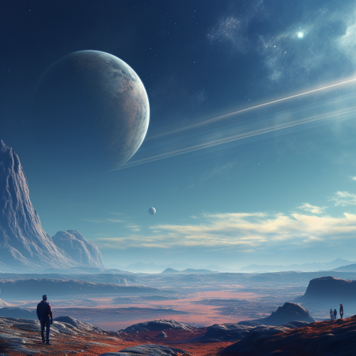 wide view of horizon from an alien planet, looking up at the sky where a ringed gas giant planet is visible in the day sky