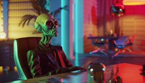 8k ultra-realistic photo of an advanced humanoid alien species. in a MAdison Avenue advertising agency boardroom , intense conversation, laughing, classic retro furniture, moody. , colorful, tomography, --chaos 0 --ar 7:4 --stylize 25 --weird 0 --v 6.0