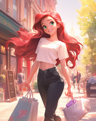 illustration style, Ariel from The Little Mermaid in casual, modern attire suitable for New York streets, wearing a white T-shirt, black jeans, and sneakers. She is walking on a New York street corner while carrying shopping bags and smiling with green eyes. The background includes shop windows and urban street details, capturing the bustling city life. The illustration should have a watercolor texture and a nostalgic atmosphere, but without any classical elements. Full-body illustration, with a focus on the street scene and urban atmosphere. --ar 4:5 --niji 6
