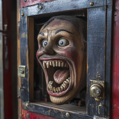 hyper realistic vending machine with a wooden puppet mechanic vampire with his teeth open inside, old carnival machine, wood, inspired by puppetery, real life hystoric machine
