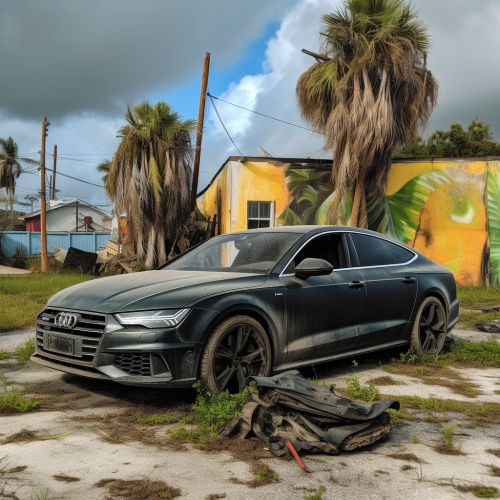 2017 black audi a7 with off road tires and a lift kit, car is outfitted with a snorkel and overlanding tires, lift kit, machine gun on roof, post apocalyptic miami beach, broken neon, lush art deco decay, hyper realism, real photo, ultra-realism --v 5.0