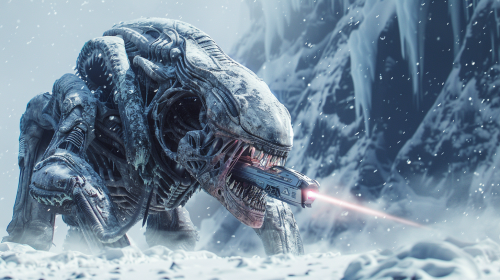 Alien with teeth and machine gun on street corner.