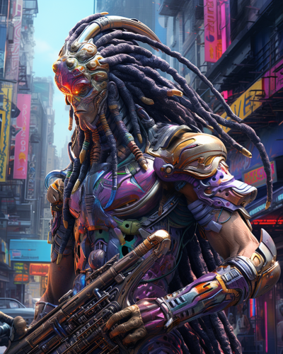 Stunning concept art, a large muscular alien cyborg, with dreadlocks and headphones playing the saxophone on the street corner, hyperdetailed, splash art, street art, spray paint, oil gouache acrylic, high contrast, colorful polychromatic, ultra detailed, ultra quality, CGSociety Epic cinematic brilliant stunning intricate meticulously detailed dramatic atmospheric maximalist digital matte painting --ar 8:10