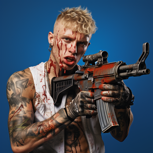 hyper realistic image of machine gun kelly with machine gun trying to shoot himself