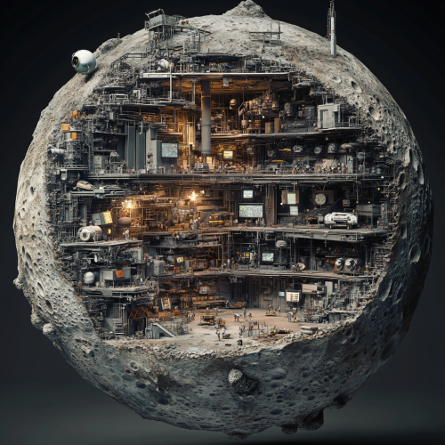 Cross section of a hollow moon filled with many levels of mechanical layers, all shiny metal, with little vehicles and computer monitors, and little cute aliens working inside like an ant hill would look like. Hyper realistic rendering.