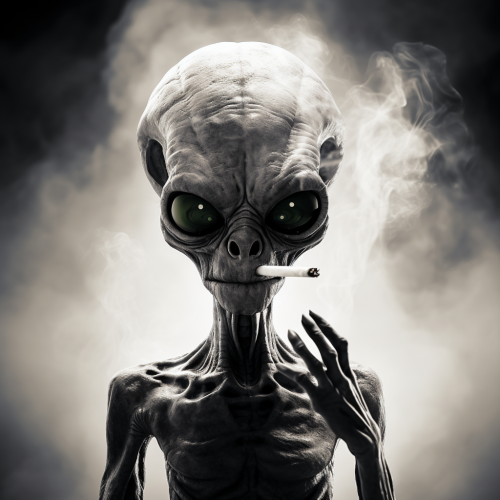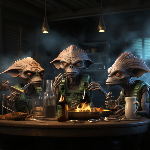 Aliens enjoying human alcholic drinks and smoking cigarettes