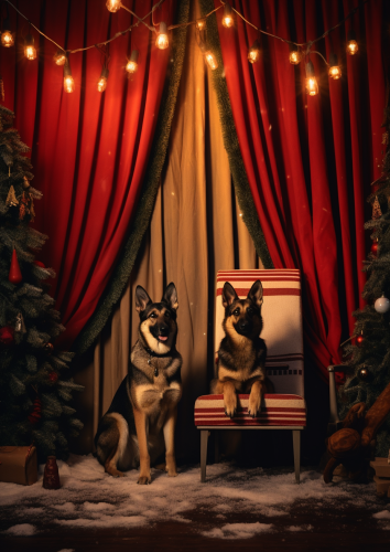 a cirque du soleil inspired christmas scene with german shepherds, creative lighting, stage lighting, wes anderson, coraline, animation, stop-motion, minitures, hand modeled --ar 5:7