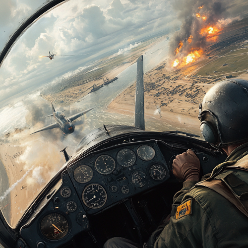 A dramatic World War II scene from the perspective of a wingman flying alongside a BF109 during a strafing run over the beaches of Dunkirk. The BF109 is seen slightly ahead and to the side, banking downward as it opens fire on the beach below. The cockpit and pilot are visible, with gloved hands gripping the controls and smoke trailing from the plane. Below, the chaos of the Dunkirk evacuation unfolds--soldiers scrambling for cover, abandoned vehicles, and plumes of smoke from burning ships. The sky is filled with clouds and war-torn haze, amplifying the tension and urgency of the moment.
