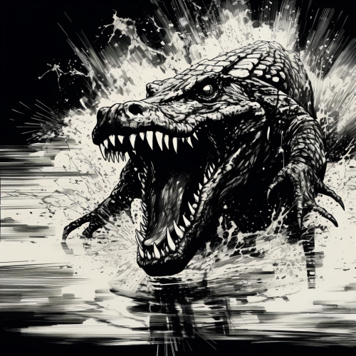 In black and white ink comic style: The alligator, an apex reptile, is characterized by its hard leather hide, with rows of sharp teeth, swift attacks from stealth, and a powerful bite, often employing a deadly death roll in hunting.