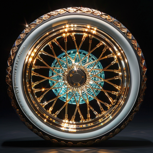 a 100 spoke Dayton wire wheel and whitewall tire, lowrider style, gold spokes, gold spinner, illustrative, colorful, animated --v 6.0 --s 250