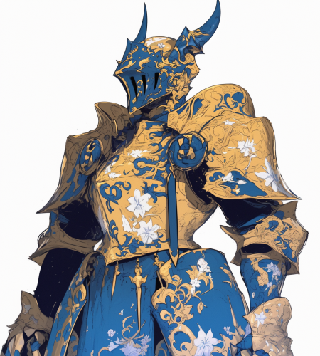 A blue and gold armor with white floral patterns, fantasy-style artwork, white background, detailed character illustrations, texture-rich canvases, strong lighting contrasts, playful character design, isolated on a white background. --ar 115:128 --niji 6