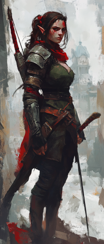 Female half orc fighter. Dark Fantasy setting. The mood is ethereal. Watercolor art style with soft washes of color and fluid details. The background is a medieval city with some white space. --ar 3:7