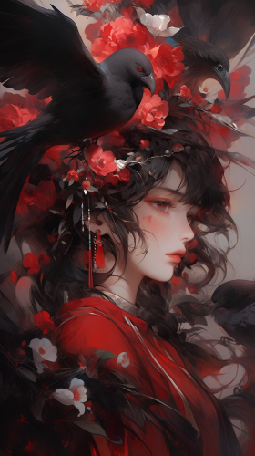 the painting from lilyruq mf, in the style of realism with fantasy elements, red and black, ethereal illustrations, dramatic use of color, birds & flowers, split toning, large-scale portraits --ar 9:16 --niji 5