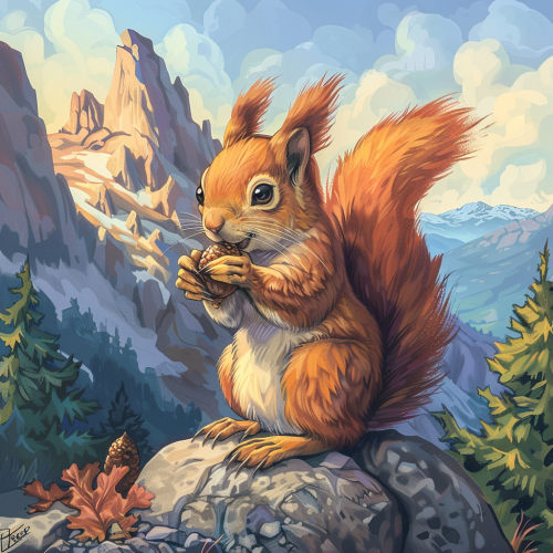 A cute squirrel happily eating an acorn on a mountain, illustrated in vibrant niji style. The squirrel is sitting on a rock, holding the acorn with both hands, with a joyful expression on its face. The mountain background is detailed wi --v 6.0