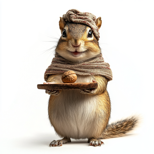 photo real image of a full body chipmunk, smiling, standing upright on hind legs, facing the viewer, holding a wood tray with an acorn on it, the chipmunk wears a white wimple headdress on its head, white background