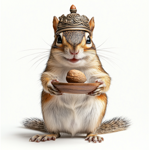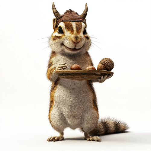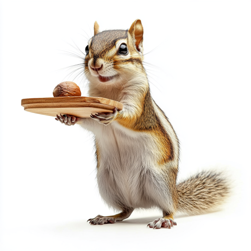 photo real image of a full body chipmunk, smiling, standing upright on hind legs, facing the viewer, holding a wood tray with an acorn on it, the chipmunk wears a Escoffion on its head, white background