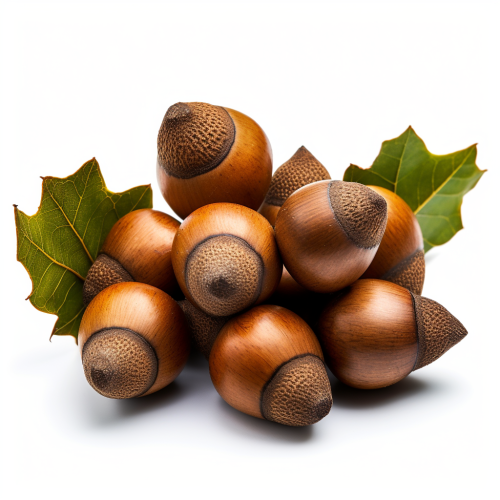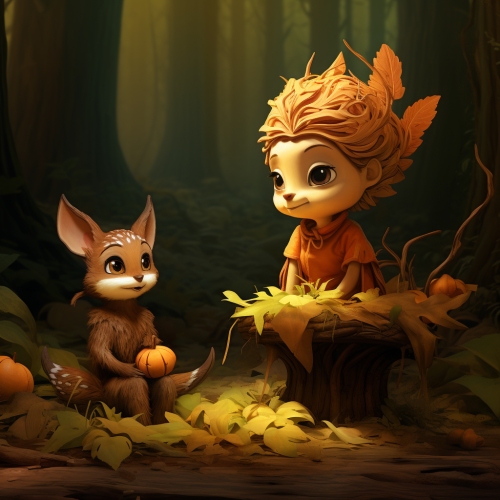 a character inspired by an acorn who meets a character inspired by a fawn, sitting on a chestnut
