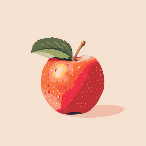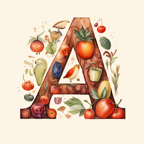 Alphabet educational poster with letter A and illustrations including one apple and one acorn. Alphabet colour is red, letters and illustrations blend together, watercolour tones