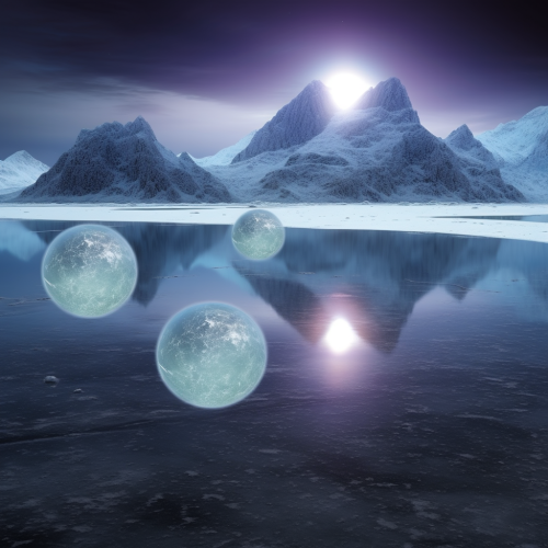 frictionless ice surface of a frozen lake reflecting three moons in the water, surrounded by mountains, sci fi fantast art --w 88