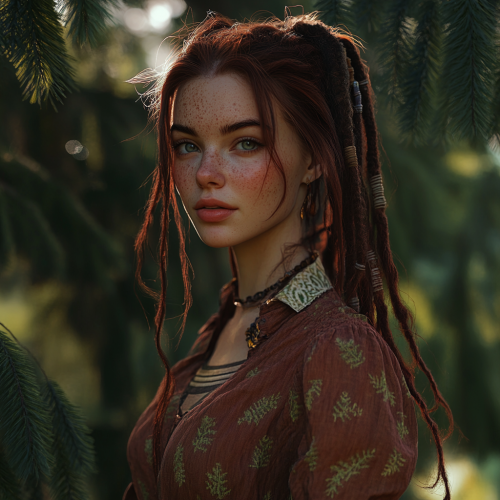 realistic full body image, beautiful 22-year-old model girl, dreadlocks, freckles, natural, happy, 8k, ultra-realistic, stylish fashion, coniferous forest, twilight light, hyper-realistic, elegant, hyper-realistic, over-detailed, shading, pure artistic style, full HD, Sony Alpha 7