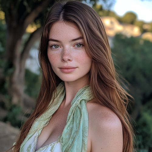 A beautiful young woman in her early twenties. Straight, hazelnut brown hair with a long strand on her right haning down. Greenish brown eys. Semi long pinted noise. V shaped face with a healthy blush. Natural full lips. She is wearing a green blueish baret and a white top with a silk scarf. In the background, an old quaint South European village. The twilight hours of a sunset.