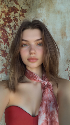 a portrait photo of a beautiful young lady in her early twenties, looking youthful and charming. Straight, hazelnut brown hair with a long strand on her right haning down. Greenish brown eys. Semi long pinted noise. A slim pointy V shaped face with a healthy blush. Natural full lips. She is wearing a red strapless dress and silk scarf around her neck. In the background, a faded painted wall with vines. The twilight hours. Red and gold hues. Hot day, sweaty skin. No freckles. --ar 9:16