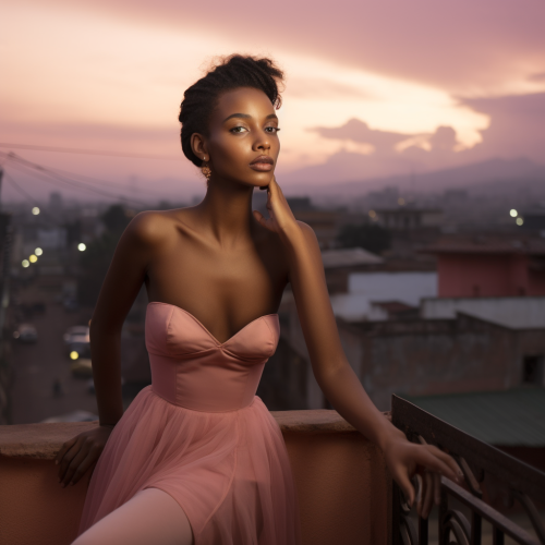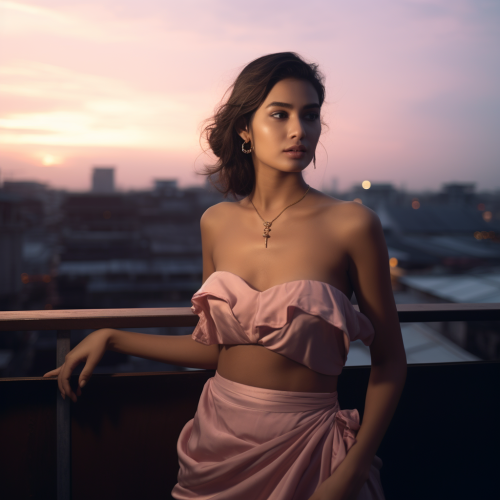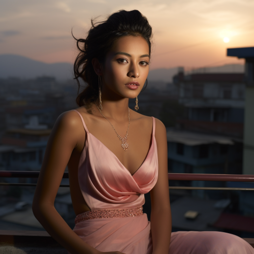 photograph of young Bhutanese woman on a rooftop at twilight. She is wearing a pink strapless dress and a pearl necklace, with an elegant demeanor. The background features a soft sunset sky and silhouetted cityscape, likely signaling the end of the day 6:8