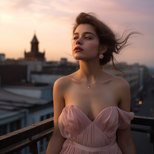 photograph of young Hungarian woman on a rooftop at twilight. She is wearing a pink strapless dress and a pearl necklace, with an elegant demeanor. The background features a soft sunset sky and silhouetted cityscape, likely signaling the end of the day.