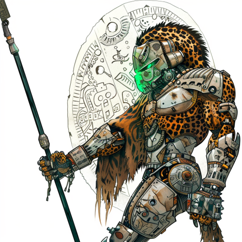 full-body shot, leg mecha Mayan warrior dressed in jaguar skins and war paint, half of his face covered with metal sheets and an eye glowing green. A hand holding a spear made of metal and muscle. Shield, leg supplemented with metal parts replacing some muscles, drawn in a comic book style, video game sprite, synthwave,Custom option crisp set to coloring pages, crisp lines, mandala, white background, --no shading, --v 6.0