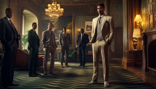 a well dressed golf player, standing beside a group of lawyers in the lobby of the Bristol hotel, photorealistic, fashion photo shoot for Vogue magasine, uhd image, 8k, in the style of saturated colorism, --ar 7:4 --style raw --stylize 50 --v 6.1