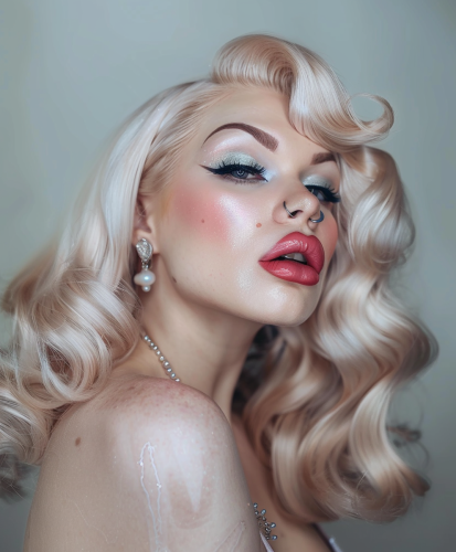 Amanda lepore wearing clear glass wig, in light pink makeup, in the style of Patrick Nagel, Evelyne Axell, bold colorism, black-and-white, light blue and dark brown, elegant, emotive faces, surrea, hyper realistic, attention grabbing --ar 53:64