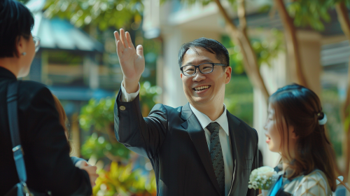 an asian male hotel staff is waving goodbye at a family at a new 2023 modern pan pacific hotel, 35mm lens, --ar 16:9
