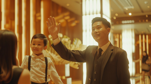 an asian male hotel staff is waving goodbye to a kid and a family at a new 2023 modern pan pacific hotel, 35mm lens, --ar 16:9