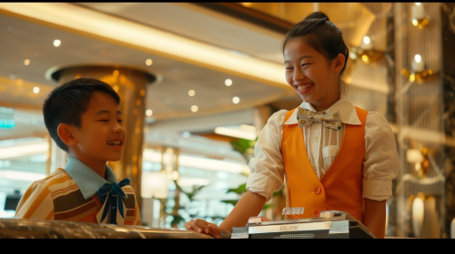 a hotel staff is winking at a kid at the hotel lobby at a new 2023 modern pan pacific hotel, 35mm lens, --ar 16:9