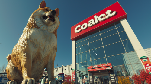 シバキチがコストコの前に立ち、背後に目立つ赤いコストコサイン、青空背景、低い視点からのシバキチの幸せな表情、明るく鮮やかな色使い --ar 9:16 --v 6.0
