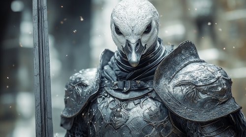 goose as a medieval fantasy warrior, with a long sword in hand, wearing polished silver plate armor, low quality, vintage film quality, 1980s cinematography, grainy, in the style of 1980s DVD screen grab of a dark fantasy, --ar 9:16 --v 6.1