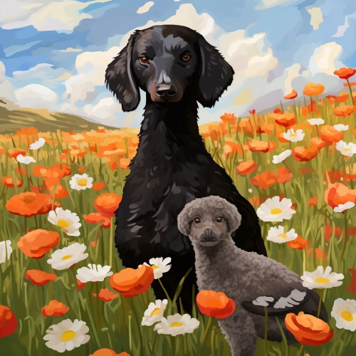 black miniature poodle and goose in field of flowers, untitled goose game art style