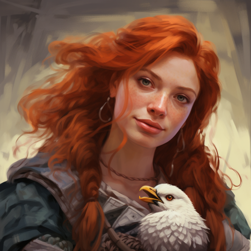 head and shoulders portrait of a female druid, dungeons and dragons, silly look, red hair, freckles, holding a Canadian goose