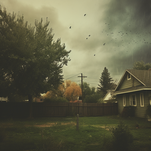 analog photo of american backyard in the hood, rainy evening, sad mood, birds flying in the sky, dust, grain, grunge. Use a old school analog camera for a vintage flavor , evoking a sense of mystery and dedication