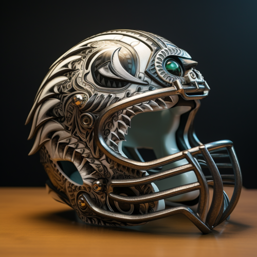 American football helmet, silver, black and white colors, Quetzalcoatl, tlalloc
