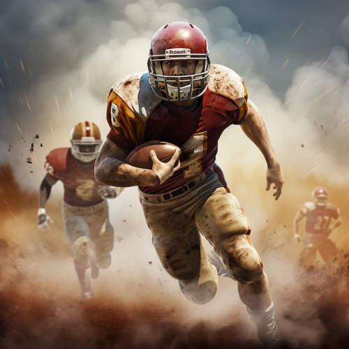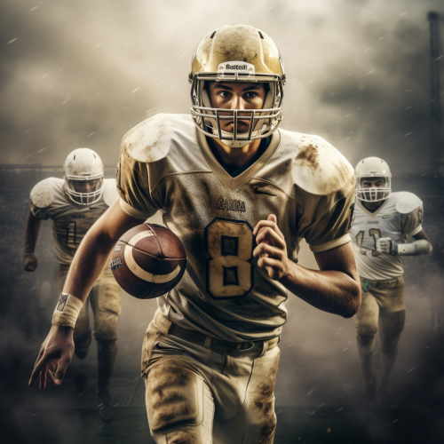 a high school American football player, running the football in a game, football field, stoic background, photorealistic
