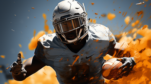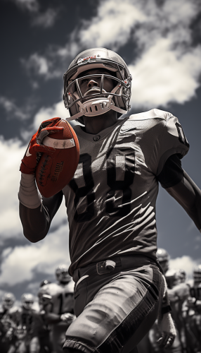 American college football. Silhouette. action shot on the field. Black and white with color splash. Vibrant color splash. Full body shot. Quarterback scoring game winning touchdown in final seconds of the game. Packed stadium. Extreme blue skies. Violent and action-packed. Exciting. Photorealistic. Black and white. High-end. Stylish. Important. Mysterious. Black and white. Shot with a Sony A7R. --ar 4:7 --q 0.5 --s 750
