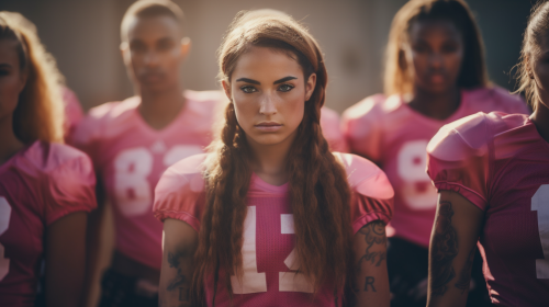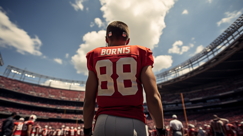 American high school football player. Extreme blue skies. Rear view of football player. Picture taken from behind football player. Action shot on the field. Extreme low angle shot. Black and white with vibrant color splash. Full body shot. Jersey number “8”. Quarterback scoring game winning touchdown in final seconds of the game. In the style of a sports illustrated cover photo. Dramatic. Award winning. Minimalist with fractal patterns. Packed stadium. Extreme blue skies. Exciting. Photorealistic. High - end. Stylish. Shot with a Pentax. K - 3 III Monochrome. --ar 16:9 --q 0.5 --s 750