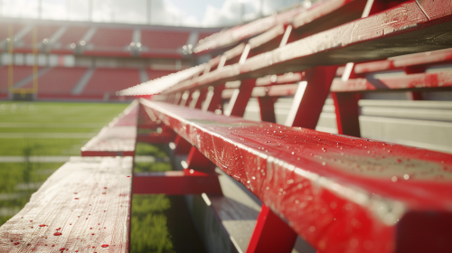 empty red bleachers at an american football game, straight on shot, shallow depth of field, photorealistic, --ar 16:9